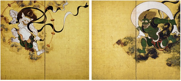 無限に広がる金地の空間に、千手観音の眷属(けんぞく)である風神・雷神が対峙する。二神の躍動感、効果的な色彩の対比、たらしこみを用いた軽やかな雲の表現など、宗達芸術の頂点を示す。