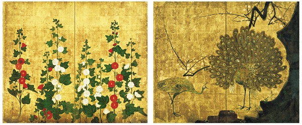 写実的な表現によるつがいの孔雀と、意匠化された立葵(たちおあい)の対比が面白い。現在は一双屏風だが、以前は衝立(ついたて)の表裏をなしていたという。