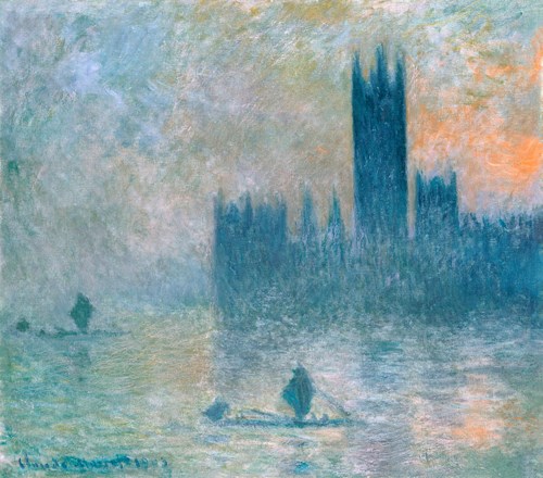 モネはまた、絵画において観察者の位置や光の状態によって世界の見え方が変化することを描いた最初期の画家の一人でもある。特に《国会議事堂、夕陽》では、建物がほぼ影となり、空と水面だけが色彩の変化を担っている。