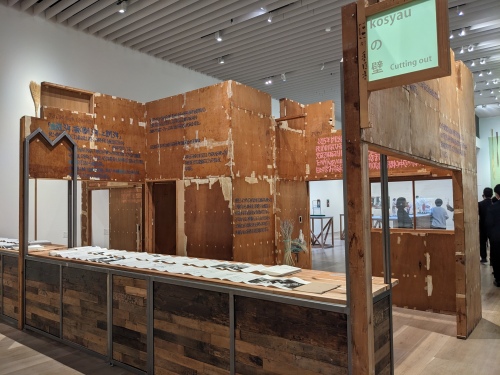 写真の《Kosyauの壁を移築する》(2022/2025)は木材や構造体を再利用した構築物で、壁面には特徴的な文字が描かれている。