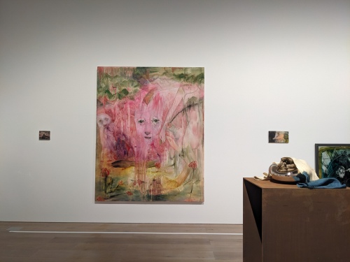 壁面に庄司朝美の作品が並ぶ。左から《25.8.19》(2025)、《25.10.31》(2025)、《25.8.26》(2025)。アーティストが自身の身体をモチーフにした作品である。見ている者を心象世界に引き込む。