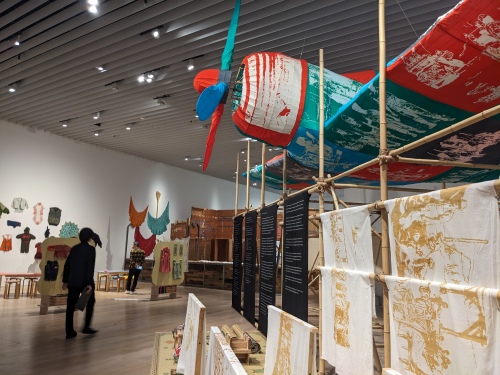 画面手前の飛行機とその下の布は北澤潤《フラジャイル・ギフト・ファクトリー》。