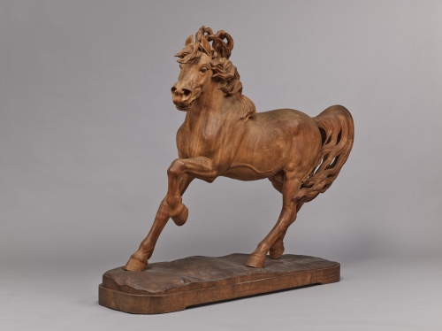 猛スピードで駆けてきた馬が急停止した一瞬の姿を木彫で表現している