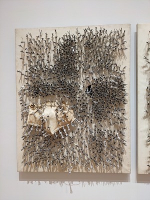 大量の洗濯バサミが大小7枚のカンヴァスに取り付けられ、抽象絵画のような趣を漂わせている。1963年の作品だ。