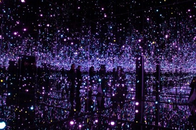 鏡を用いた《無限の鏡の間》において、その思想は明確になる。光や水玉が反射し合い、空間は終わりのない奥行きを持つ。そこでは遠近法的な秩序も、主体が空間を把握するという近代的構図も崩れる。自分の身体さえ無数に分裂し増殖する。ここで起きているのは、空間概念そのものの解体であり、自分自身の永遠への融解である。