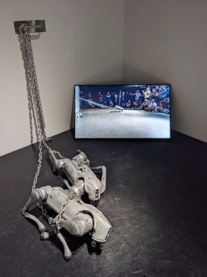人に襲いかかろうとする猛犬型の自律口ボットを、鎖に拘束した不自由な状態で、観客の前でデモンストレーションを行った。その様子を映像で紹介する。観客はロボットの攻撃が届かない安全な距離を保ちながら、その〈殺意の視線〉と対峙する。たった1本の〈倫理の鎖〉によってかろうじてコントロール下にある人工の猛獣を我々はどう受け止めたらいいのか。