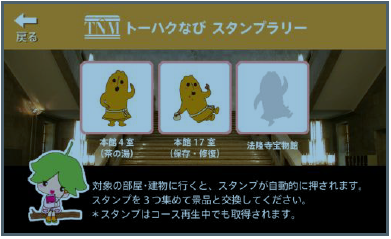 Androidマーケット上で公開する初回配布版には、スタンプラリー機能が搭載され、館内指定の3か所をまわると自動的にデジタルスタンプが取得され、すべて集めると「トーハクなび」オリジナルノベルティをプレゼントする仕組みになっています。