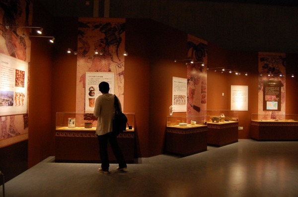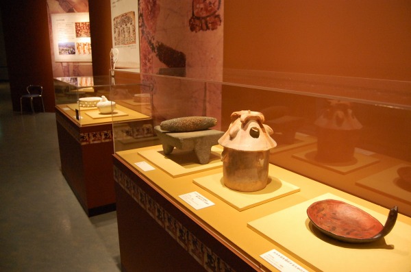 マヤ文明ではカカオは飲み物として利用されました。当時、焙炒するために使われた道具のほか、カカオをモチーフにデザインされた器などが展示されています。