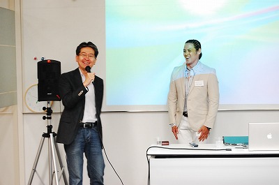 (下の写真は、2010年8月4日に行われたオープニングレセプションで挨拶する松本大氏(左)と、アーティストの中田周作氏)